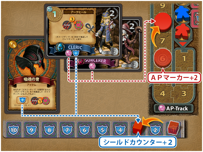 新たな《スキルカード》や《アイテムカード》を獲得したことで、アクションポイントやシールドの数に増減があった場合、ボード上のAPマーカーやシールドカウンターの位置を更新します。