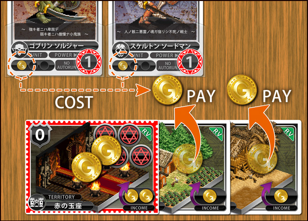 下図の状況では、ユニットの維持コストの合計は2コインなので、テリトリーカードの上からコインを2枚、カードの外に移動させます。